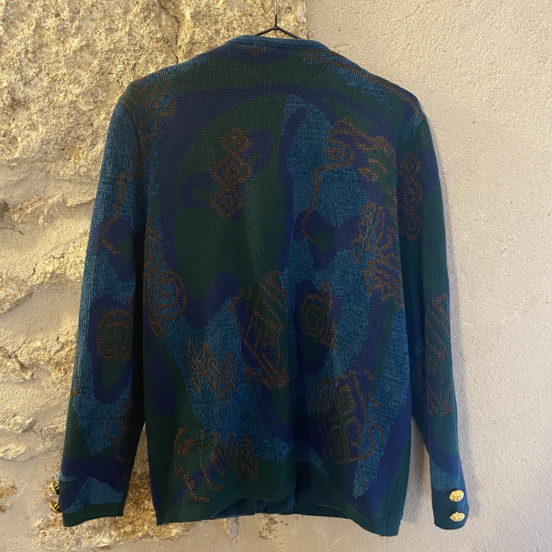 Magnifique gilet vintage de couleur bleu, vert sapin et bronze.