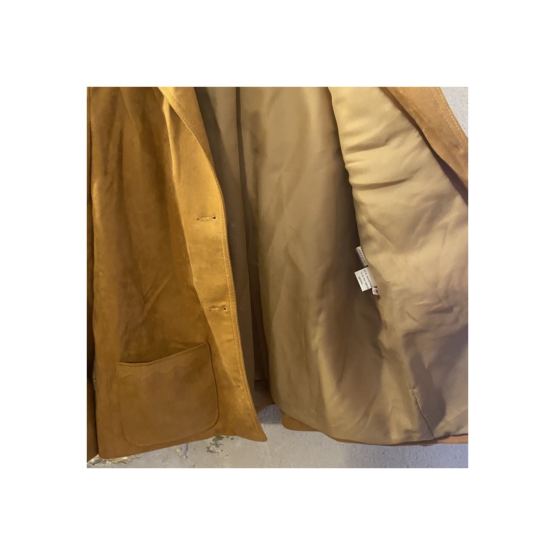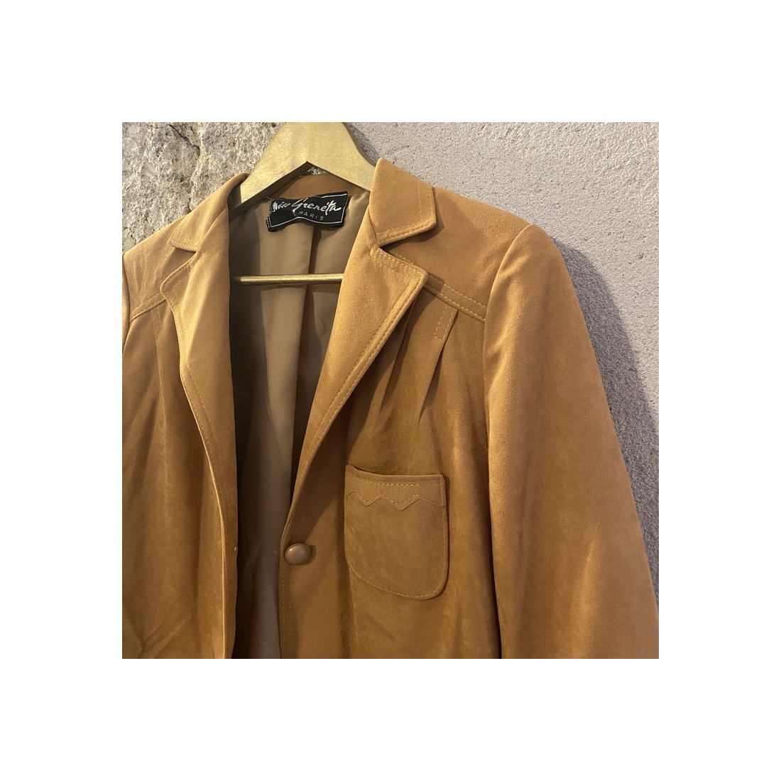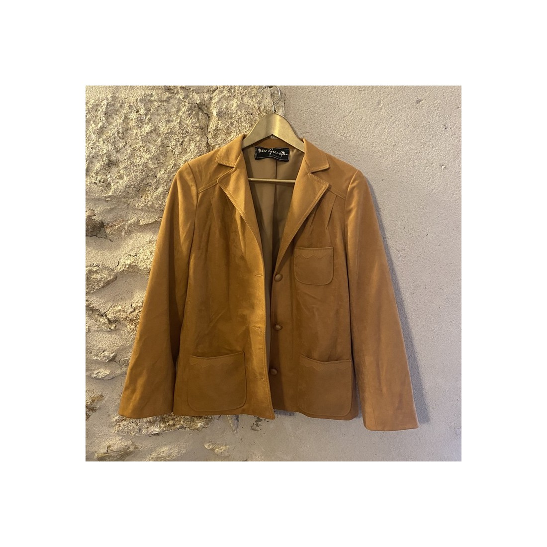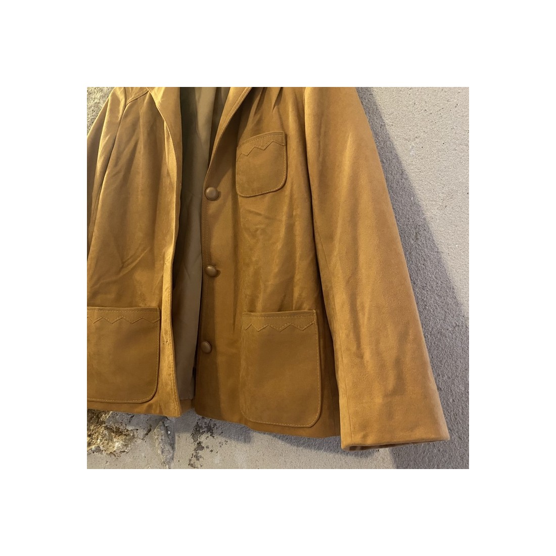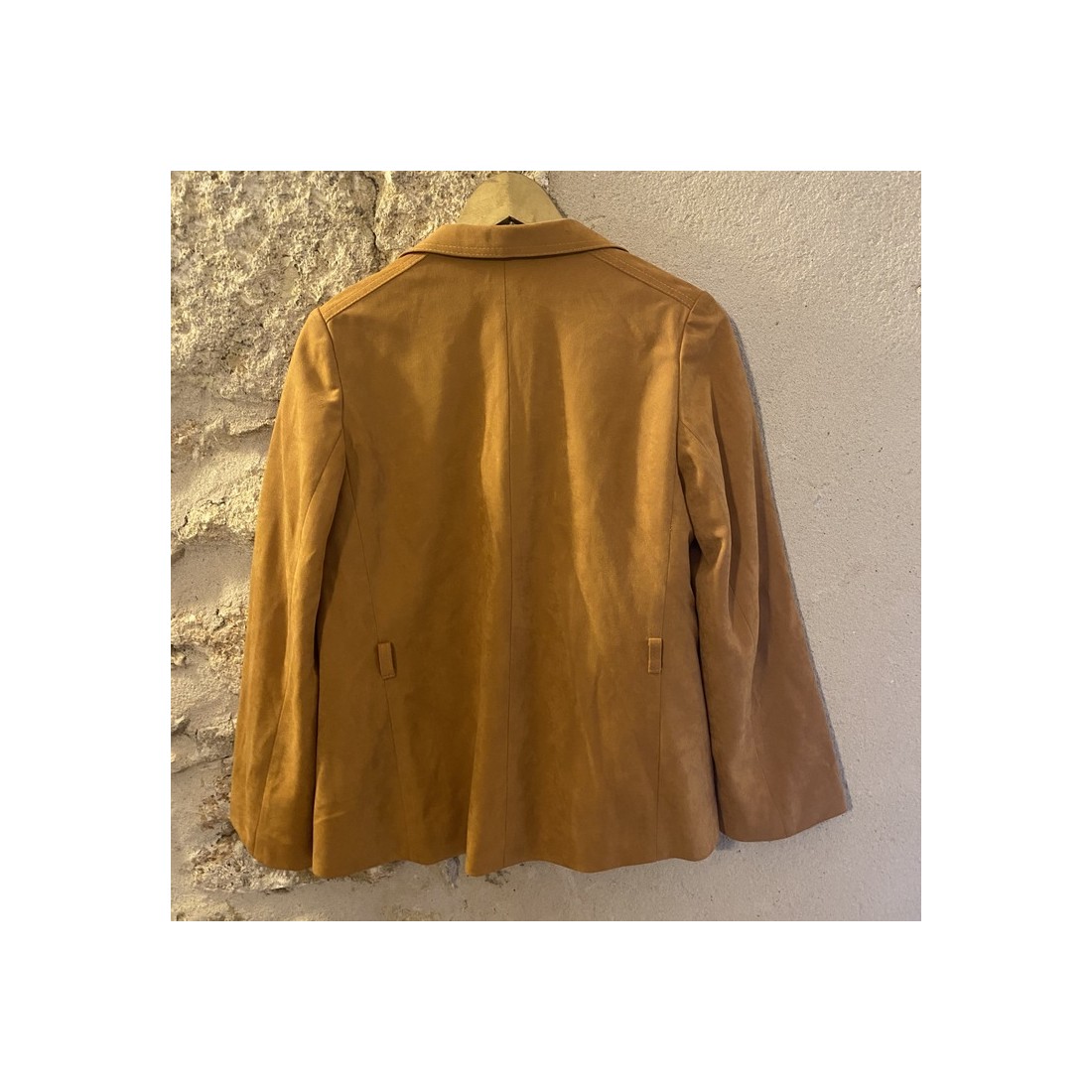 Jolie veste tissu suédine, couleur jaune moutarde, détails coutures sur les poches.